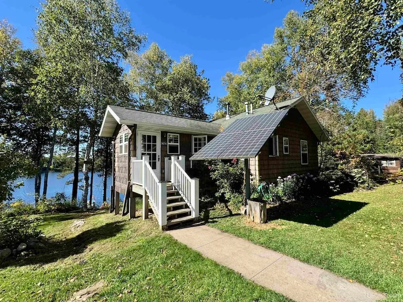 Experience true Northwoods living with this beautifully crafted 2-bedroom, 2-bathroom home set on 1.08 acres with 150 feet of frontage on scenic Deer Lake. Designed for both comfort and sustainability, the property runs on solar power and is equipped with a drilled well, septic system, and a brand-new Kohler backup generator making it ideally suited for year-round off-grid living. Inside, enjoy panoramic views of the lake from open living spaces, with a walkout basement providing additional finished space and easy access to the outdoors. A detached 2-car garage adds convenience, while the hobby farm setup featuring roaming chickens, honey bees, grape vines, pear trees, raspberry bushes, and more offers a perfect touch of self-sufficiency. Whether you re seeking a peaceful retreat or a year-round residence, this property blends natural beauty with modern amenities in a serene setting right on Deer Lake.