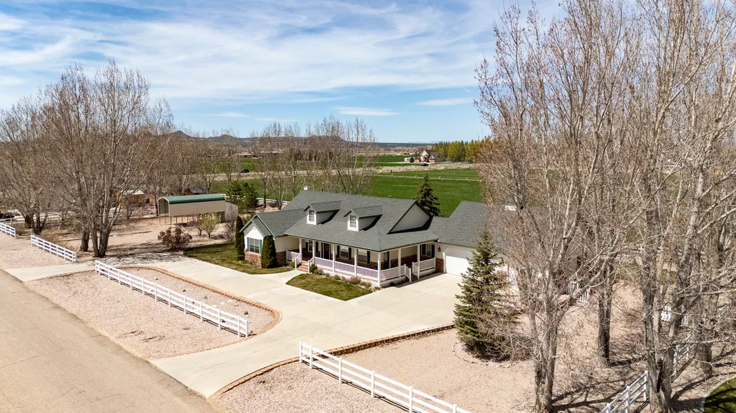 Country CHARM from the white rail fencing to the wrap-around porch! Come enjoy a full acre of fenced and landscaped property with mature shade trees, covered RV parking, storage sheds, and porches and patios to relax on and just ''take it all in.'' The single-level home is spacious with over 2500 square feet of living area and has an oversized 3-car garage. Beautiful white custom cabinets throughout with upgrades such as an impressive vanity in the ensuite primary bathroom, appliance lift, pullout drawers, and glass-fronted uppers in the kitchen. Stainless appliances include wall ovens, refrigerator, & gas cooktop. So much natural light and a cozy gas fireplace. The separate 3rd garage has a workshop area and there's attic storage and the added benefit of a remote-controlled attic lift.