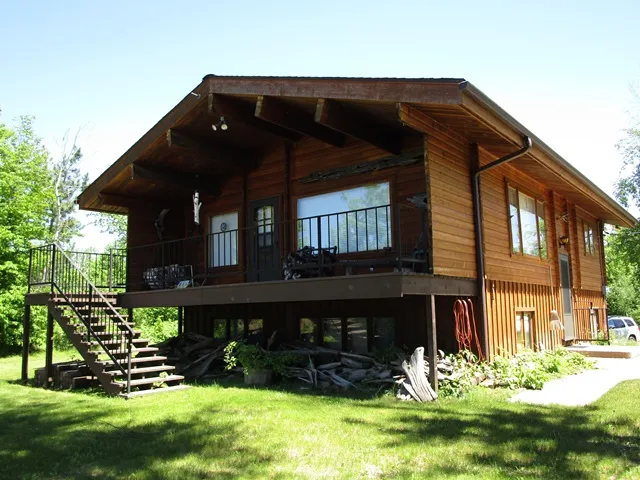 This Turtle Flambeau Flowage property features a log home situated on two lots with 3.60 acres and approx. 285' of level, western facing frontage! From the home are mesmerizing views across the water at the many islands and undeveloped State owned shoreline. Inside you'll find an open concept great room complete with a wood cathedral ceiling, wood beams, a corner freestanding stove and large waterfront windows. There is a wonderful spacious kitchen featuring wood cabinets, a large center island and pantry and is open to the dining area and living room. One bedroom and full bath complete the main level. The lower level offers large waterfront windows in the partially finished rec room, a 2nd bedroom and a spacious utility/laundry/storage room. Facing the lake is a covered deck, perfect spot to have your morning cup of java. Plus there is a huge garage with a lean-to to store all your Up N...