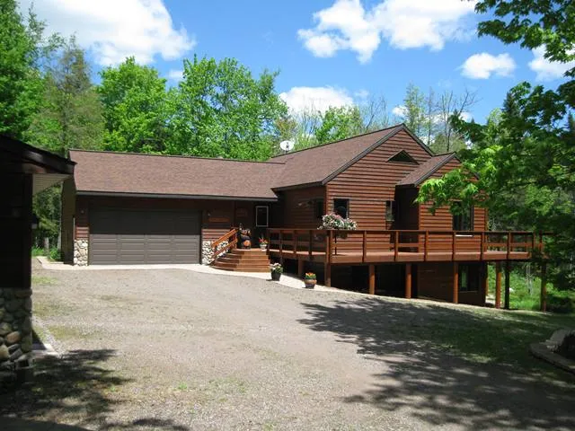 Come view this spectacular waterfront home priced nearly $150,000 below replacement value! All offers will be considered! This luxurious private home offers 4.5 wooded acres, 330 of level frontage. Quality built home loaded with classy features. 2 entrances allow for your choice of either a formal entry for guests or a mudroom from the garage. The great room is simply breath taking w/huge waterfront windows surrounding the massive fieldstone fireplace, while a stunning built-in entertainment center polishes off the look. Towering above all is a cathedral end-matched basswood ceiling. The elegant kitchen contains hickory cabinets, a center breakfast island, granite counter top & walk-in pantry. Soft lighting, a built-in china cabinet & French doors highlight the dining room. The roomy master bedroom is complete w/waterfront patio doors, a walk-in closet & full master bath. The LL features in-floor heating, a spacious family room, 2 bedrooms, full bath, sauna, hot tub & even a built-in wine cellar! There is a 2-car attached garage, a 4-car detached heated garage, and all in cedar siding & stone. Gorgeous new deck, patio walkways, lighted path!