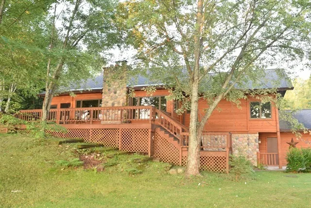 Truly a private, majestic setting, featuring 28 acres and over 1,100' of frontage on Musky Lake. A blacktop driveway leads to this hidden treasure where you'll find level frontage, huge towering trees, a private boat launch, landscaped Lakeside fire pit area and 2 piers A huge WF deck stretches across the home, while the exterior is wrapped in hand hewn log siding accented with stone. The inside offers a breathtaking open concept complete with impressive custom made kitchen cabinets, quartz countertops , cathedral ceiling with log beams, massive stone FP and loft office overlooking it all! An exceptional 3 season porch, 3 bedrooms, full bath and laundry closet complete the main level. The lower walk out offers a spacious family room, 2nd bath, den, office, and finished 3+ car garage. Lakefront privacy at its best with the modern convenience of 40 MB DSL High Speed Internet!