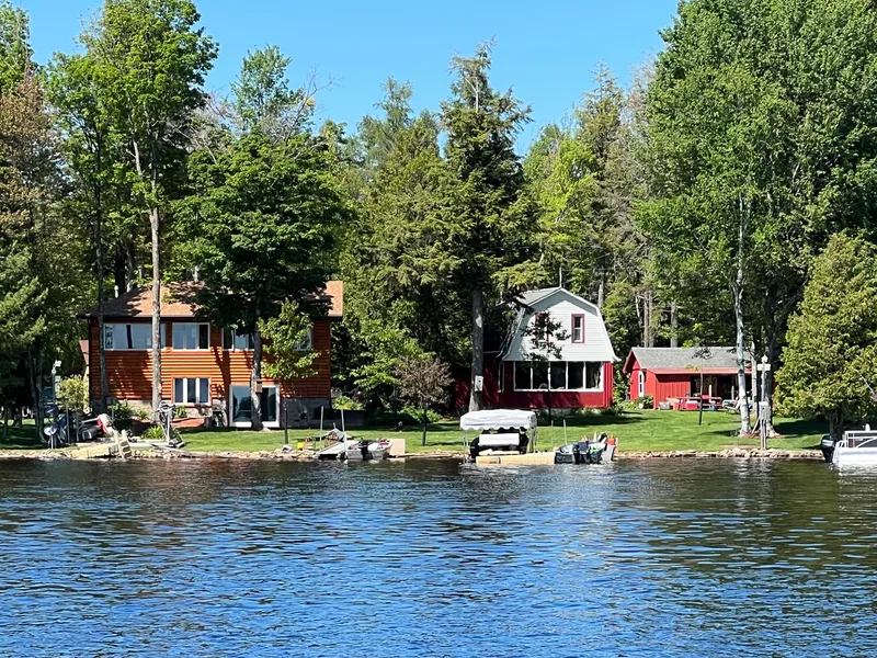 Perfect level sand frontage, facing south on the Turtle Flambeau Flowage featuring the most beautiful, picturesque view of State-owned islands! This complete package includes an extremely well maintained 2-bedroom 2 bath home, plus the cutest seasonal 4-bedroom log style cabin that is currently a VRBO, a 36x24 log sided garage, a 24x30 metal pole building and a 34x22 1 car garage with a workshop! New 3 bed septic installed approx. 9 years ago, along with new windows and new log siding & attractive stone on the home. Amazing waterfront views, gorgeous rustic hickory cabinets, center island, finished walk out LL, stunning landscaping, large yard for games, firepit and lakeside patio. Come check out all this amazing property has to offer!