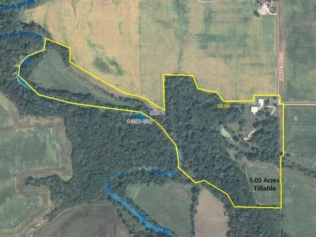 +/- 60 acres total, +/- 5.05 acres in soybean and corn production, House and barn sits on +/- 5 acres, remainder of land is wooded. 2,500 sq. ft. home built in 1974, well and septic. Morton Pole Barn 60' X 75' X 16', concrete floor, electricity, and LP radiant heater on east end of building. 32' X 48' barn with lean to. Frontage on sugar creek. Excellent whitetail deer, turkey and small game hunting. Numerous home or cabin construction sites. An ideal property for livestock and or pasture development. This is a very unique property setting; massive old growth Oak Timber surrounds the home place with frontage on Sugar creek.