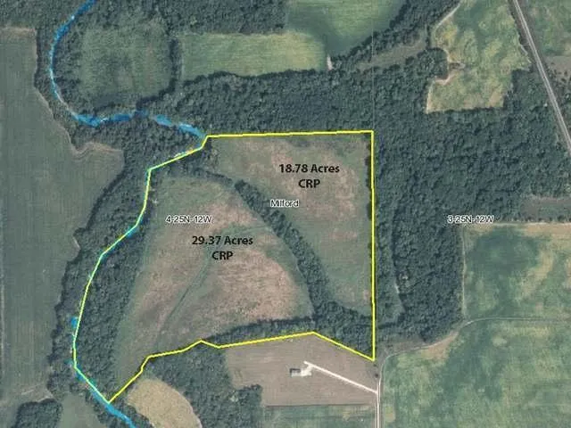 +/- 60 acres total, +/- 48.15 acres CRP paying $199/acre until the fall of 2013. CRP income of $9,581/yr. Frontage on Sugar Creek, Sugar Creek is the west boundary of the property. Located on the end of a dead end road. Private and secluded. Excellent whitetail deer, turkey and small game hunting. This is an income producing property offering excellent white tail deer, turkey and small game hunting. Sugar creek is a natural funnel for deer and turkey movement.