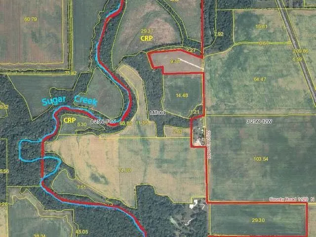 Old growth Oak Timber surrounds the home place with over 2 miles of wooded frontage on Sugar creek, 137 acres of tillable ground producing soybeans and corn, 53.5 acres of CRP ground offering excellent year to year income. This farm is surrounded by large tracts of agriculture and timber, bordered by Sugar creek on the entire west boundary. This is some of the best combined income and whitetail deer, turkey, and small game hunting the Midwest has to offer.