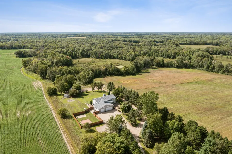 Magnificent 5-acre property that offers country living with so many amenities! 2-full kitchens with a full guest suite in the lower level with separate walk-out entrance, plus a separate entrance to the attached garage! The attached garage offers heated floors, mini-split AC & heat, pellet stove heat, water, a floor drain & walkout access to the fenced in yard & patio! Additionally, the insulated outbuilding has its own electric & a floor drain! The entire walk-out lower level has in-floor heating, walk-out family room with an entertainment system & office. Upstairs you'll find a spacious kitchen w/ center island, a perfect dining room & living room w/ fireplace and breathtaking views of your property! 3 bedrooms on this level including the Primary Suite w/ gorgeous full bath! Imagine life in the country on your private 5-acre property w/ woods & trees surrounding. Incredible views, quietude of nature, yet so comfortable & modern inside your home! Just minutes from Cambridge & 1 hour to the cities!