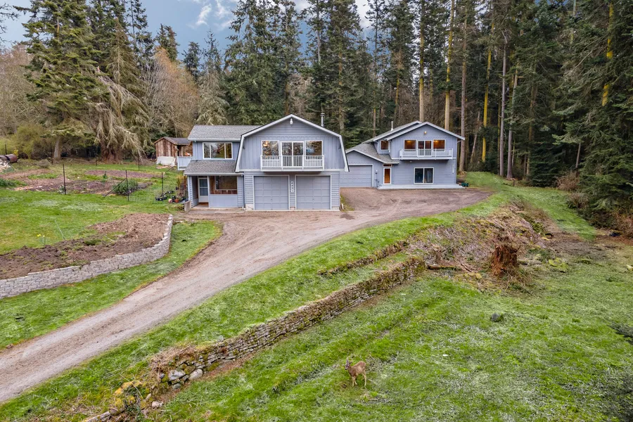 Heres your opportunity for 2 homes on nearly 4 picturesque acres on gorgeous Whidbey Island. Perched amongst the trees on the outskirts of Mutiny Bay with views of Admiralty Inlet & the Salish Sea, both homes feature walls of windows that flood the home with coastal light, private balconies, wood-burning fireplaces to keep you cozy year-round, open-concept living & dining, hardwood laminate floors, and meticulously detailed island-native woodwork throughout. The main home boasts 3 bedrooms & 2 full baths & the Guest house adds another 1 bed & 1 bath. The huge finished carpenter's shop also has a full bath and separate entrance. Beach Rights included for the nearby private community beach - soak in the sun, lapping waves & mountain views!