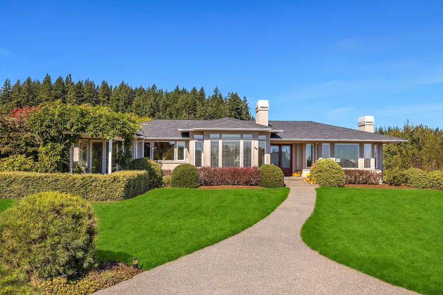 Spectacular Sound & Mountain View home is perched on one of the largest and most PRIVATE lots in this highly desired and gated neighborhood. Grand entry opens to soaring great rooms that offers natural light and walls of windows. Enjoy ALL main-level living spaces that look out to Sound and Snow-Capped Mountain views. Beautiful mature & professionally landscaped grounds boast in color. Quality built home offers boxed ceilings, 2 fireplaces, stunning Chefs kitchen, 4 bed/5 bath and sprawling patio for private entertaining. Separate Den/bed w/ bath on lower level. Winding paved driveway leads to 3-car + a separate shop in back. Community Park w/trails, clubhouse, + secured RV/Boat parking. Impeccable Estate Home, feels brand new. See video!