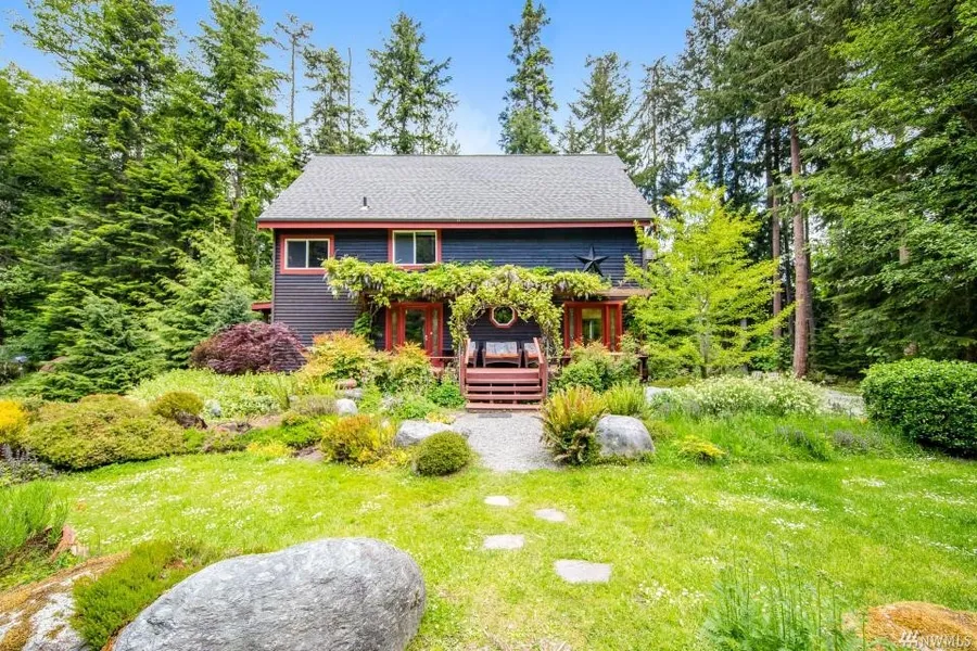 Reconnect in nature at this one-of-a-kind eco-retreat on 2.5+ secluded acres in desirable North Camano Island. Available fully-furnished and ready to enjoy as your private oasis or business investment as a turnkey profitable short-term rental (STR) with option for an expanded retreat center. Built entirely of trees from the property, the home features Mortise & Tenon craftsmanship, a great room with 30-foot beamed ceilings, soaring windows, two kitchens, commercial stove, and artisan touches such as hand-carved banister and stunning stained glass wall. The gorgeous grounds, two private ponds, new hot tub, fire pit, both large and intimate outdoor meeting spaces - plus a standalone eco-dome studio - complete this inspiring Northwest retreat.