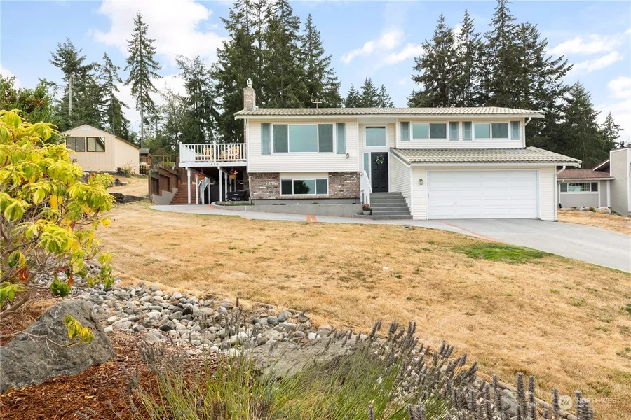 Enjoy spectacular sunrises & dramatic views over Dugualla Bay & Mt. Baker while enjoying your coffee out on your deck or from the comfort of your own Living room. Situated on 1.2 +/- acre lot w open grassy spaces & wooded trails, a large deck & fully fenced sport court set up for pickleball/basketball. Updated throughout you'll enjoy being able to move right in & all the projects are done! A spacious living room open to an updated kitchen w a large island, endless counters & a slider out to the back. Primary bedroom w a ensuite w a tile shower. 2 bedrooms upstairs. Downstairs features family room w/fireplace, additional bonus room, den/office space & a newly remodeled bath. Community features a clubhouse, community beach & boat launch.