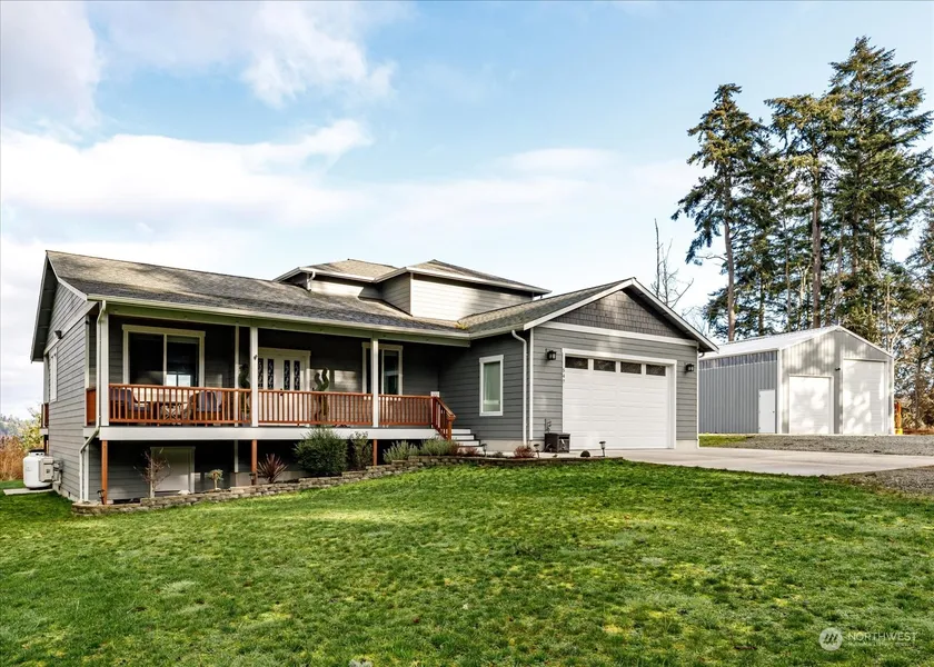 Welcome to this almost new and one of a kind, 4 bdrm home situated on 5 view acres among beautiful mature Douglas Fir trees! This light filled home features lots of windows, cathedral ceilings and 9 ft ceilings upstairs and down. Spacious main level master suite complete with double vanity, huge double headed shower and walk in closet. Plus a second master upstairs with continental bath! Walk out onto the upper deck to beautiful views overlooking Dugualla Bay, the entry to La Conner/Swinomish channel, Mt. Baker and more!! Beautiful hickory kitchen cabinets with solid surface counters, & stainless appliances! And a new 24x38 shop for RV parking and all your toys!