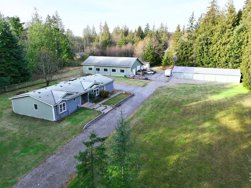 SHOPS, TWO HUGE SHOPS! 50x72 + 40x72. Run your business from home. In fact bring the Semi Truck and RV. 12' & 14" high doors. No CC&Rs, and its Private!! RARE opportunity to have garages for 18 cars. Perhaps indoor pickleball court. Quit paying high storage fees. Endless possibilities. 5 shy LEVEL acres. PLUS this 3 bedroom home EACH with its own Bathroom! Fenced for the dog. Roof is 4 years, Furnace 3-years new, Real Hardwood Floors and New carpet. Poured foundation with nice patio and a firepit for outdoor parties. Vaulted ceilings & SS appliances. Outbuildings are plumbed with AIR. Perfect mini-farm with attached possible stable area. Bring the horse, chickens and goats. All usable acreage. Like commercial with a residential price point.