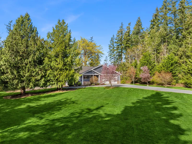 Imagine... Surrounded by towering trees with Elger Bay trails out your back door, this level and all usable 2.4-acre sanctuary offers single-level living designed for entertaining. Features include an open layout, vaulted ceilings, gas fireplace, travertine, hardwood floors, and faux paint accents. Large kitchen offers custom painted cabinets, and travertine floors, and large eating bar for 4. The spacious primary suite boasts a 5-piece bath, walk-in closet, and private deck access. Enjoy 3 sunlit decks, a hot tub, a separate art studio, oversized 2-car garage, and an 800 sq. ft. heated shop/game room with separate entrance. PLUS RV/boat parking and garden space complete this peaceful, private retreat. Close to beaches and elementary school.