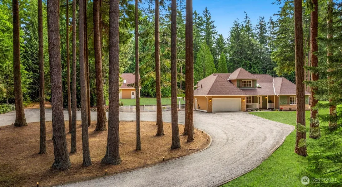 A Whidbey Island Estate with Storybook Charm. Two acres, private and peaceful with a lovely backdrop of evergreens. Outdoor living with a white picket fence, new deck overlooking the hot tub & immaculate garden beds. A covered front porch welcomes you to this exceptional retreat. Completely renovated throughout with designer finishes and high-end upgrades. A beautiful expansive great room with a dramatic vaulted ceiling is the heart of the home. Chefs kitchen with granite counters. Main floor living includes a primary suite and a guest bedroom with a bath. Two bedrooms upstairs feature a full bath. Discover the detached shop with an unfinished upstairs offering many possibilities. Enjoy Island Living. Fiber-optic internet!