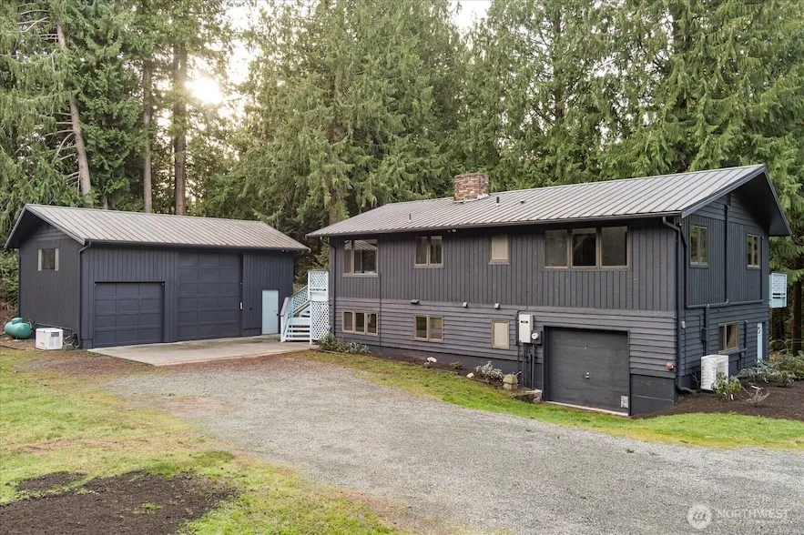 Imagine a truly unique island property offering flexibility, privacy, and income potential just two miles from charming Langley Village. Set on 5 acres, this 1,794 sq ft 2-bedroom, 2-bath home with a 3-bedroom septic features two separate living spaces, each with its own kitchen ideal for rental income, guest quarters, or multi-generational living. An elevator connects both levels, and the spaces can be combined if desired. Additional features include a whole-house generator, shop/garage/RV space, car lift, storage container with covered storage, large fenced garden, and deeded beach access at the end of the road. A rare and versatile opportunity on Whidbey Island.