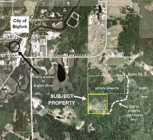 Over 39 acres of land just outside of Bigfork. Level land wooded with young Aspen and a border of Spruce/Fir along the north boundary. Surrounded by thousands of acres of public land. Near Chippewa National Forest and Bigfork State Forest. Public access to Bigfork River right in Bigfork. Existing access is via a trail through public land (not an easement); buyer is responsible for securing easement(s) for access.