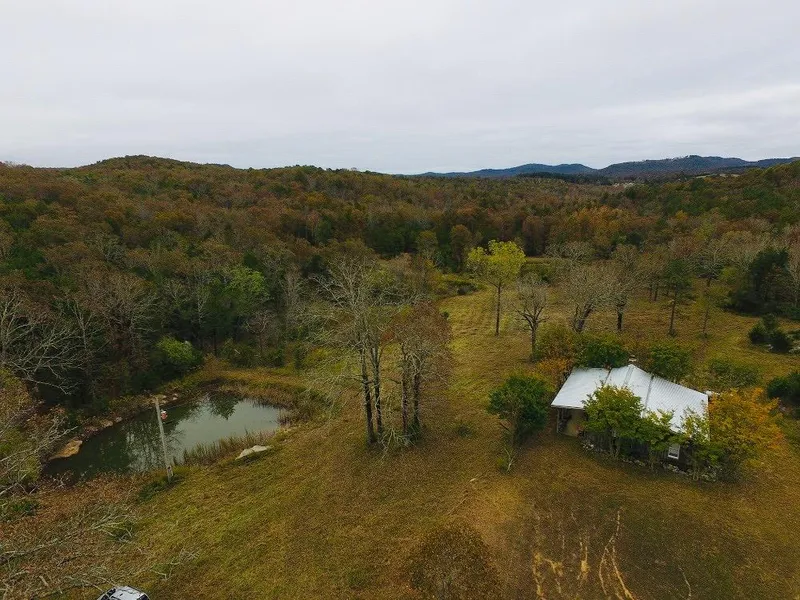 This is a scenic hunting ranch located in the beautiful Ozark Mountains of North Arkansas. The property fronts a good county road and has a locked gated entrance. Enter the gate and drive 1.3 miles on your own road to a picturesque valley that once had an old homestead and a big spring to supply it with water. At the old homestead now, sits a newer cabin and a huge metal storage building. The cabin features 2 bedrooms 1 bath and an open living room and kitchen. The living area has an old time native stone fireplace and exposed beams above. The owner drilled and new well down by the spring which supplies sweet water to the cabin. The spring supplies water to 3 ponds down the valley in front of the cabin. This 470 acre hunting tract has miles and miles of good trails and roads through out the property. The 470 acres has beautiful marketable timber and some of the b...