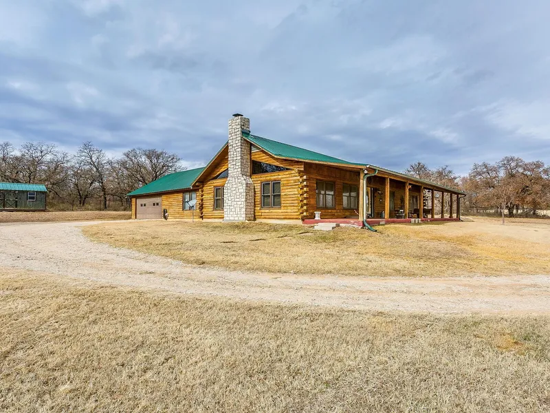 Wonderful 54.39 acre property with rolling topography and nice oak trees. This beautiful log cabin is move in ready with spacious living room, large outdoor patio for entertaining and pipe fence around the house make it ideal for house animals to be let out with comfort. The three larger tanks are stocked with catfish and bass. The large shop is big enough for your tractor, toys and also has a conex box tool and feed shed all wired with electricity with an additional shipping container outside for extra storage. Cedar greenhouse is just outside the open barn that includes a tack room and stall.