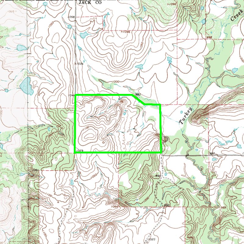 This scenic Texas ranch is located in northwest Jack County, on the edge of the seasonal Turkey Creek. Its diverse vegetation, abundance of water, and excellent cover creates a supurb wildlife habitat, as well as grazing for livestock.