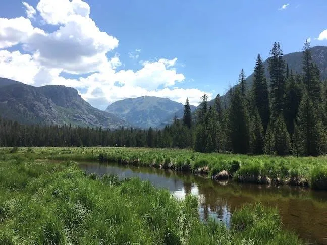 Beautifully forested area of pines and aspens, in a valley surrounded by the Rocky Mountains.