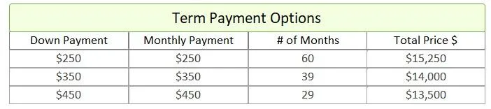 Term Option 1: $250 down, $250 for 60 months, for a total price of $15,250