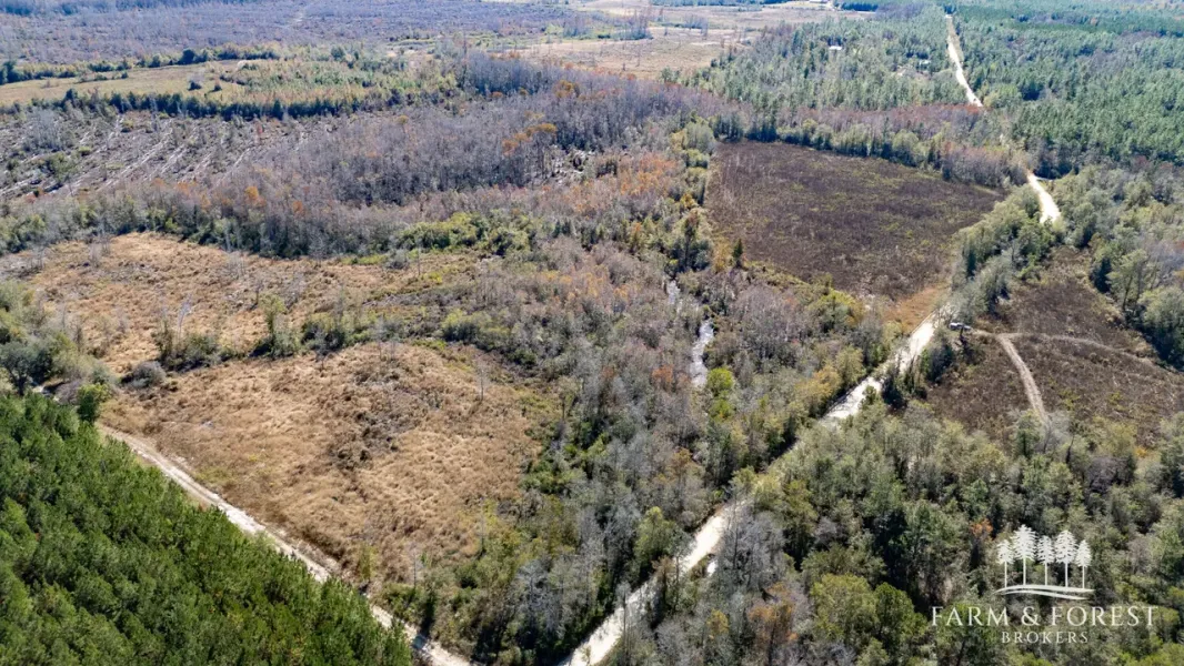 The property includes a mix of hardwoods, cypress, and a creek, along with 12.5 acres of CMP Elite Loblolly pines planted in January 2024. The natural habitat provides solid hunting opportunities for deer, and other game.