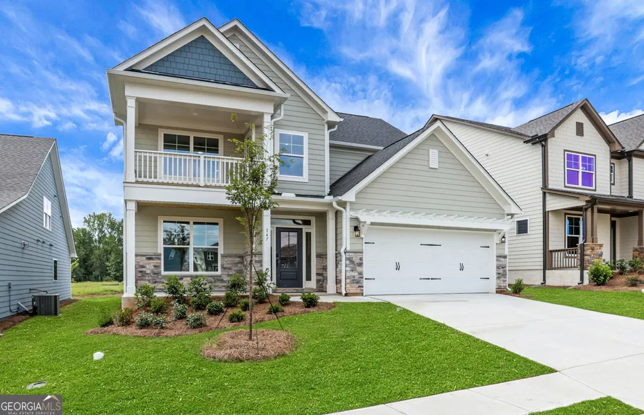 MOVE-IN READY, this Cypress floor plan by Eastwood Homes combines style, space, and versatility in the highly desirable Twin Lakes community. The main level includes a private office with glass doors, a guest suite with a walk-in shower, and a gourmet kitchen with white cabinetry, warm finishes, quartz countertops, and a 5-burner gas cooktop. The kitchen opens to the breakfast area and living room, where a stone fireplace with a cedar mantel extends to the ceiling. Step outside to enjoy a screened-in covered porch and extended concrete patio, overlooking a green and spacious backyard. Upstairs, the luxury primary suite features a spa-like bath featuring a large shower and seat, while a spacious loft with plank flooring serves as the perfect second living space. From the loft, step out onto a private deck overlooking the front of the home, offering a unique outdoor retreat. Generously sized secondary bedrooms complete the upstairs layout. The highlight of this home is the third-floor bonus room with a full bath, ideal as a media room, private guest suite, or flexible living space. Exterior details include architectural shingles, HardiePlank siding, and stone accents, along with the charm of double front porches. At Twin Lakes, residents enjoy lakes, a pool, clubhouse, fitness center, cabana, dog park, and more-all just minutes from shopping, dining, and I-85.