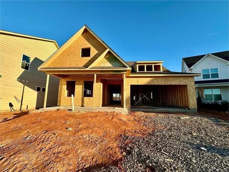 The Avery floor plan by Eastwood Homes offers ranch-style living with designer touches and an upstairs retreat in the highly desirable Twin Lakes community. Step inside the wide, welcoming foyer that opens to a spacious family room anchored by a shiplap fireplace with a cedar mantel. Just off the foyer, glass doors lead to a private office. The gourmet kitchen features quartz countertops, a shiplap hood vent, white cabinetry with warm undertones, a farmhouse sink, and gold fixtures, blending modern elegance with farmhouse charm. A screened-in extended back porch overlooks the backyard, perfect for relaxing or entertaining. The laundry room adds a pop of character with deep blue cabinetry, while the main level is finished with durable plank flooring-no carpet. The primary suite features a luxury soaking tub, oversized shower with bench seat, and dual vanities. A guest bedroom with a full bath is also located on the main level. Upstairs, a bonus room with the third bedroom and a full bath provides a private retreat for guests or flexible living space. Exterior highlights include architectural shingles, HardiePlank siding, and stone accents for timeless curb appeal. At Twin Lakes, residents enjoy lakes, a pool, clubhouse, fitness center, cabana, dog park, and more-all just minutes from shopping, dining, and I-85.