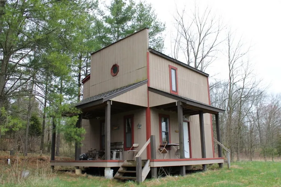 Kick back and relax on your front porch. Simple weekend property backs up to Hoosier National Forest. 1 room on main level has kitchen cabinets microwave, refrigerator, stove and has a free standing wood stove. Upstairs serves as a bedroom and includes an electric furnace. A/C units built in the wall on each level. Antique barn shows as being built in 1900. Nice stand of pine trees shade behind the house. Hunt or just need a getaway, this spot could be for you.