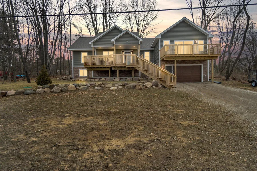 ~Calling all Lake buyers and commuters!!~ Welcome to 1002 Otney Dr. This raised Ranch Home was built in 2021 and is overlooking 350 acre All Sports Gilletts Lake in Jackson County. Home features 3 bedrooms and 3 bathrooms, and a popular open floor plan with a bonus room above the garage. Kitchen has quartz counters and a large island and is part of the great room that could be configured as more dining space or living room/family room. There are 3 bedrooms on the main level including a master with custom tres' ceilings and a large walk in closet and master bathroom with corner jetted tub and large walk in shower and double sinks. Basement is full of potential with more living space and has another bathroom and bedroom has been studded for finishing. It is also plumbed for a wet bar.