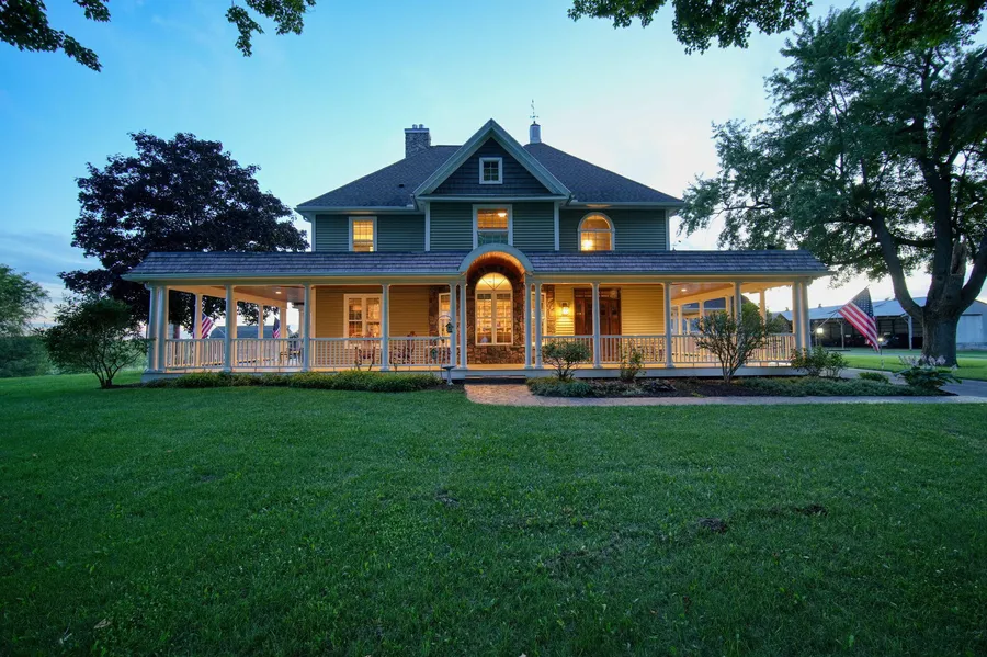 Step into a world of timeless charm and modern luxury with this extraordinary 1888 farmhouse, exquisitely renovated and rebuilt from 2007 through 2010. Nestled on over 35 picturesque acres, this 4 bdrm, 2.5 bath gem is a sanctuary of elegance and comfort. As you drive up the streetlamp and tree-lined circle driveway, you'll be greeted by a grand portico and a wrap-around porch that spans three sides of the home, inviting you to relax and take in the serene views. Inside, marvel at the stunning oak woodwork, original staircase with wrought iron details, and beautifully preserved New Hampshire plank floors that speak to the home's rich history. The heart of the home is the gourmet kitchen, equipped with a four-burner gas stove, grill, griddle, and a large Caesarstone Quartz-topped island. Imagine cozy evenings by the kitchen fireplace, or hosting dinner parties in the formal dining room, complete with a dual-sided fireplace also open to the living room. The spacious living room offers multiple seating areas, while the enclosed sunroom provides the perfect spot to enjoy breathtaking sunsets. Upstairs, the primary suite is a haven of tranquility, featuring a dual-sided fireplace also open to the large bath with a soaking tub, and a glass-enclosed shower finished in tumbled travertine with a heated floor. The second-floor laundry adds convenience, and the impressive bonus room, with wet bar, fireplace, built-in surround sound system and panoramic views, makes an ideal executive office or entertaining space. The completely refinished and refined basement is a wine and cigar lovers paradise to either escape or entertain. Surrounded by native field stones and stamped concrete floor the wine storage and wine bar, walk-in humidor and in-ceiling speakers invite you to relax. Outside, the backyard is an entertainer's dream. Enjoy the unique stone and cedar bathhouse with a full shower and bath, stamped concrete patios, a bar/serving area, gas firepit, and stunning lighting that highlights the home's custom features. Explore two acres of naturalized walking trails lined with oak, maple, and hickory trees. With six barns, including two fully restored, with game rooms and heated storage, and a newly remodeled drive through 89x36 pole barn for large RV's, boats or trailers, this property offers endless possibilities. Whether you're seeking a private country retreat, a wedding/event venue, or a storage facility with easy highway access, this historic farmhouse is the perfect canvas for your dreams. Seize the opportunity to own this unparalleled piece of Parma history!