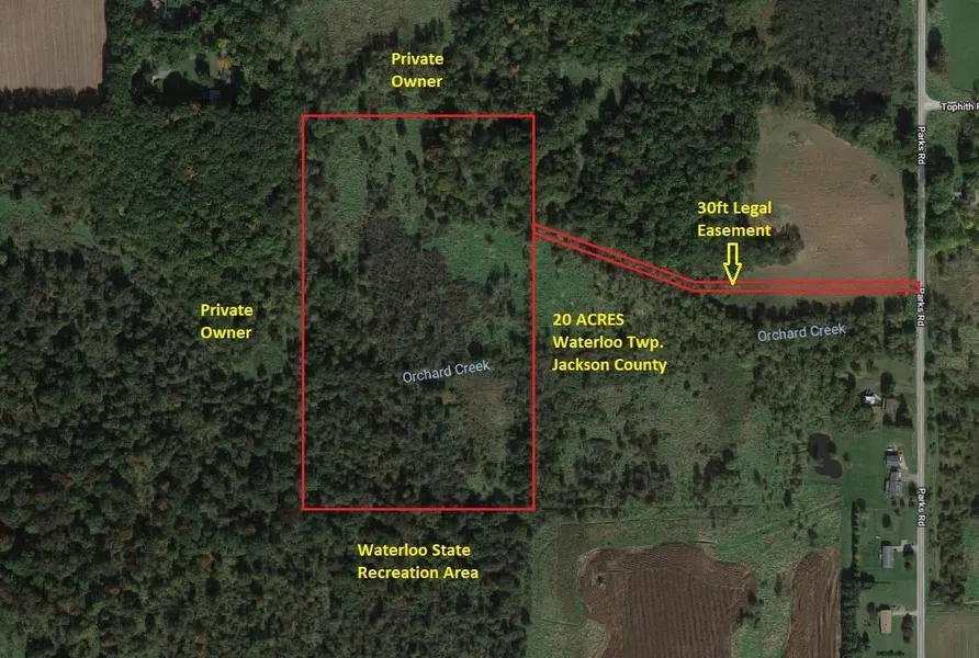 Everyone knows that Jackson County is known for great hunting & Big Bucks and this secluded 20 acres definitely fits the profile! Accessed by a 30ft legal easement off of Parks Road, this property consists of high & low ground with thick brushy cover and water to attract & hold those big bucks and gobblers! The South end of the property borders the Waterloo State Recreation Area and the Orchard Creek flows through as well to provide an excellent water source! If you are a serious hunter wanting to get up close & personal to those whitetails and turkeys, don't hesitate and contact Brandon Podolak today at 989-251-9060.