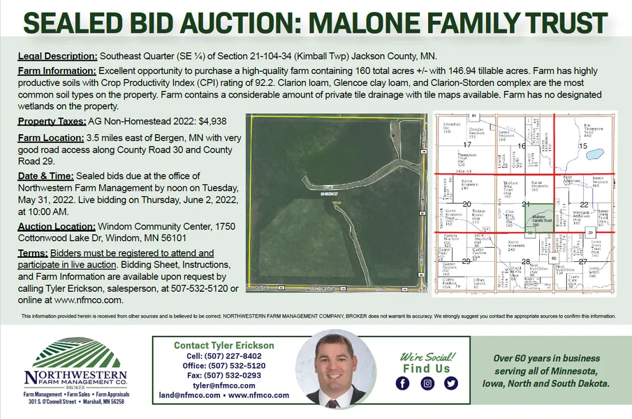 Date & Time: Sealed bids due at the office of Northwestern Farm Management by noon on Tuesday, May 31, 2022. Live bidding on Thursday, June 2, 2022, at 10:00 AM.