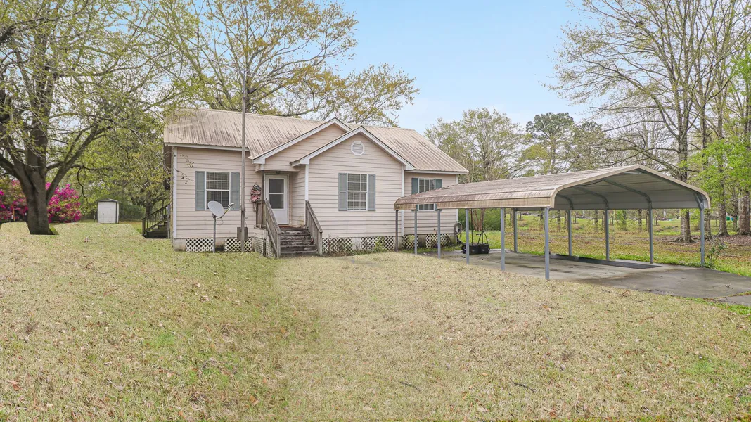 BACK on MARKET-Cute house sitting on over 1 acre! Living area has high ceilings that is open to the kitchen and eat in area. Kitchen has granite counter tops. Spacious bedrooms, with large owners suite with walk in closet! New flooring installed in living area & bedrooms. Fenced back yard, storage shed, & metal roof! This home is located towards end of street that offers privacy. Buyer could not close so here is another chance to make an offer on this property.