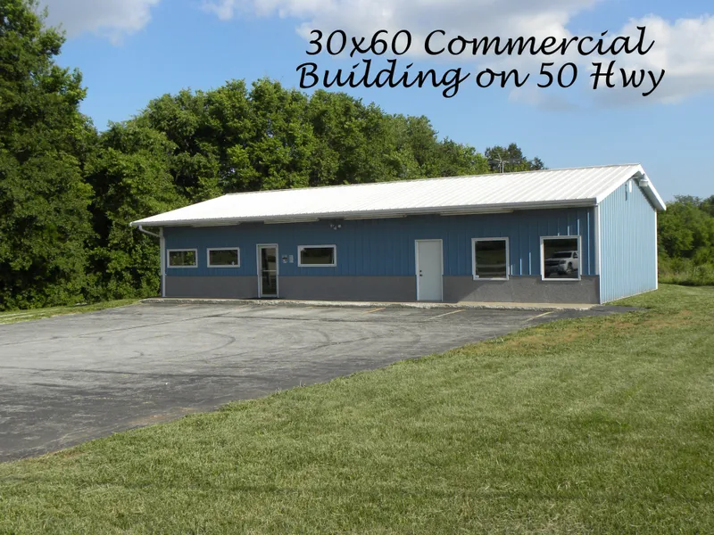 Great location on U.S. Hwy. 50, TWO ACRES with a 30 x 60 Morton Building, 10" thick walls, two exterior walk-out doors on the south side of building, and two doors on the front of the building. Large blacktop parking lot. The building has 1/2 bath, and is plumbed for a 2nd bath. Has been divided before into two store/office fronts and could be again. It has its own septic system. This previously was Lone Jack Video.