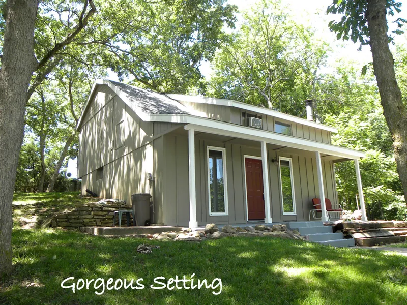 Private, treed setting with well maintained cabin-type home, 5ft front porch along with patio for grilling surrounded by trees, cute eat-in kitchen, wood-burning stove in living room, 1/2 bath and laundry just off bedroom on main level, master area in loft with 2 walk-in closets and access to 10x10 deck, 30x24 outbuilding with finished, insulated area including heater and window a/c, water & electricity plus 14 ft overhang, great access to 50 Hwy in Lone Jack school district, 2nd bedroom has non-conforming window..