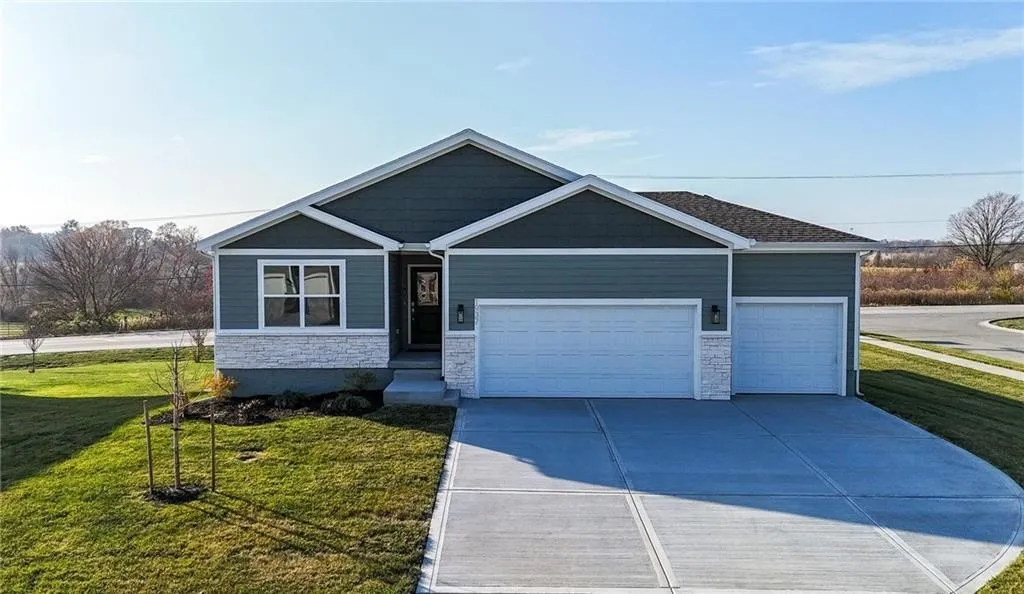 The “Harmony” plan by Avital Homes is available for quick move-in! Where the beauty of open-concept living meets the ease of single-story luxury. This 3-bedroom, 2-bath ranch plan welcomes you with an open staircase and seamlessly integrates spacious Living, Dining, and Kitchen areas for a harmonious living experience. This home will features a cozy fireplace in the living room and the Dazzling & Devine professionally curated design package. The primary suite takes convenience to the next level, effortlessly connecting to the laundry room. Explore the option of adding an additional level of comfort with the lower-level finish, offering a spacious Rec Room, an extra bedroom, and bath. Experience the perfect blend of simplicity and sophistication in the art of harmonious living. This home features upgraded laundry room floor tile and upgraded kitchen backsplash tiles. Stoney Creek HOA is only $640 annually and includes trash, recycling, planned social activities, clubhouse, 3 pools, walking trails, playground, volleyball and sidewalks adjacent to Osage Trails Park.