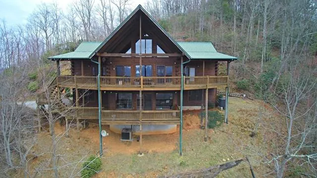 Beautiful mountain top log home with 3 bedrooms, 3 bathrooms, fireplace in master bedroom, 2 additional fireplaces, tile master bath with whirlpool tub, wood floors, granite counter-tops, hickory cabinets. Nice family room/den in lower level with 3rd bedroom and 2 bonus rooms. Covered porch and deck with outstanding views.
