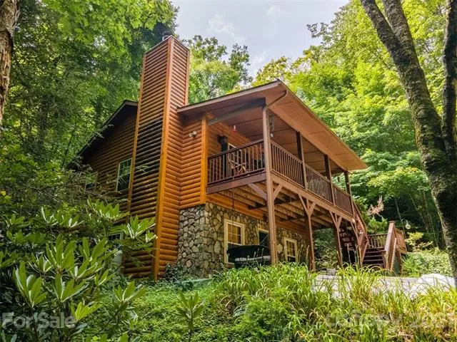 HIGHEST AND BEST OFFERS BY 6PM ON SATURDAY 8/14. PREAPPROVAL REQUIRED. Log cabin bordered by Balsam Mountain Preserve, rhododendron, natural waterfalls and bold creek. Small close knit gated community has six homes and year round access. Partially fenced yard. Creekside firepit with hand-rails leading down gravel path. Two parking levels. Enter the cabin from the covered front porch into a great room with gas fireplace; kitchen island with breakfast bar; kitchen with hickory cabinetry and granite tops; primary bedroom and bath. Hardwood floors, tile and carpeting. Or enter from the back of the homes and walk in with no stairs to climb. Follow spiral staircase down to family room with fireplace with outside entry; second bedroom; full bath and laundry room. Furnishing negotiable outside closing. Perfect weekend get-a-way or full time residence. Waynesville and Sylva close by as well as Bl...