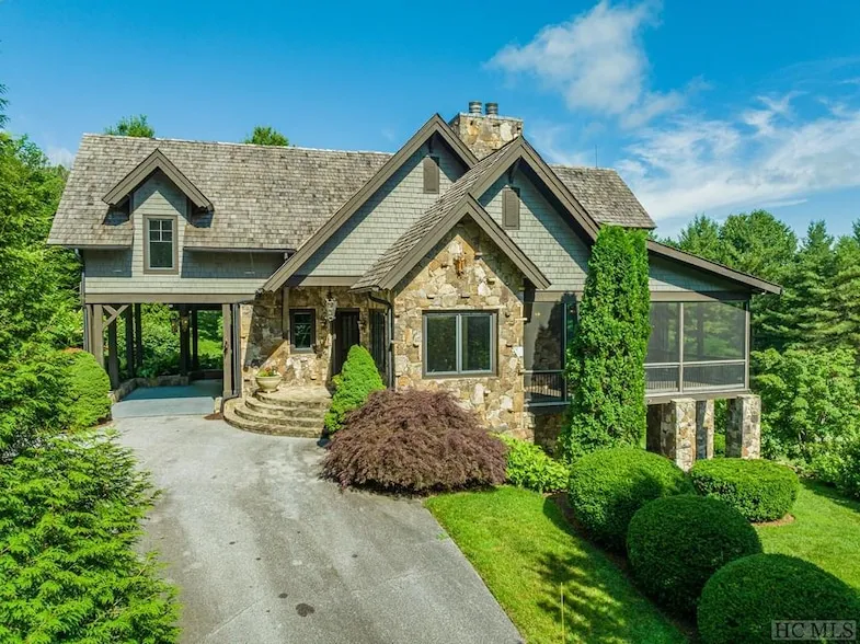Perched high on a hill above Lake Glenville within Cashiers' Trillium Links and Lake Club sits this stunning home clad in beautiful stone and shingle. Containing a magnificent great room with a vaulted ceiling and 4 spacious bedrooms, the home is perfect for hosting guests. Residents have access to 4.5 bathrooms with conveniences like oversized showers for a spa-like experience. A modern kitchen with state-of-the-art appliances is perfect for the home chef, and everyone can enjoy the den/game room with wet bar. Offer friends a peek into your wine cellar containing a stained-glass light fixture and a custom-painted vineyard scene, while giving them the privilege of choosing a special bottle for the evening. Then gather under the dining room's antler chandelier conveying a touch of rustic mountain elegance. A magnificent oversized stone terraced fire pit is ideal for cozy evenings under the stars. Or if you prefer warming yourself under a protective roof, enjoy a wood-burning fireplace in the great room or on the screened-in deck replete with Ipe Brazilian wooden deck boards. A short trip down to the lower level gives one access to an easy-entry hot tub for ultimate relaxation while admiring the wonderful landscaping of natural stone, rhododendrons, and the beautiful lawn that surrounds you. Even the laundry room has unique features like a copper double sink and an under-counter wine cooler. The whole house dehumidifier and heat pump maintain a comfortable indoor climate, while multiple closets and storage areas help ensure your home stays organized. Do not miss the detached playhouse either, complete with a porch, loft, flower boxes, and a shingled roof. Come visit the epitome of luxury, comfort, and convenience combined into one exquisite residence, making it the perfect place to call your mountain home!