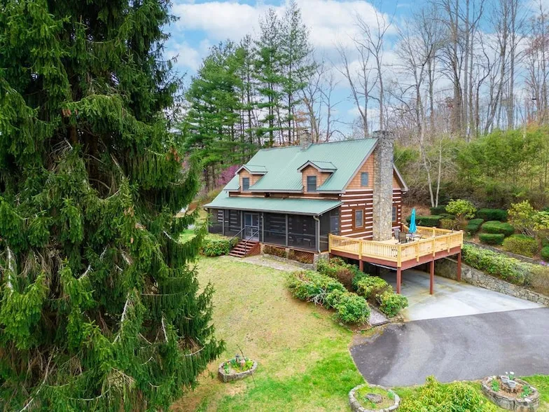 Conveniently located mountainlog cabin with paved access & mountain views sitting between Sylva & Waynesville. 3 bd, 3 ba on 1.09 ac. This home was constructed with the things a cabin in the mountain would have. Natural woods, nativestone fireplaces. Large Kitchen has plenty of cabinets, island with built in cooktop/oven-4 seat bar area & pantry. Separate diningroom off kitchen. Main level room was used as office/den area-could be converted back to a bedroom. Updates include: Bathroom updated in 2014 w/bath fitter shower, vanity & flooring Heat pump 2018 services main level & all of basement, new decking, & all exterior stained in 2024. 2nd level has 2 large bedrooms w/walk in closets-1 is primary w/updated full bath, double granite vanity, tile shower,& flooring, & heated with electric heat. Front and rear of the home have screened porches-handicap ramp on rear of home-Stone landscaping...