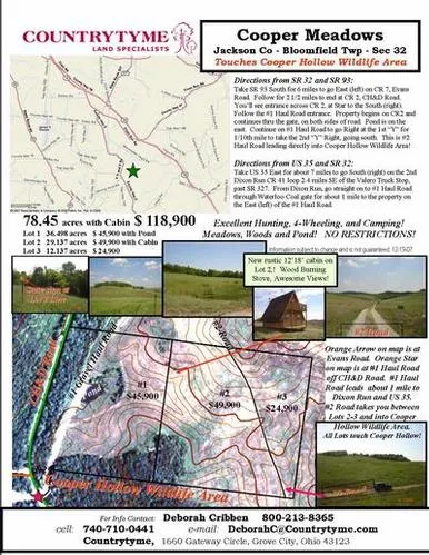 Research Parcel InformationFrom SR 32 and SR 93: Take SR 93 South for 6 miles to go east (left) on CR 7, Evans Road. Follow for 2 1/2 miles to end at CR 2, CH&D Road. The entrance across CR 2, a little to the South (right). Follow Haul Road entrance. Property begins at past gated entrance, both sides of road. Pond is on the right. Continue on Haul Road to go Right