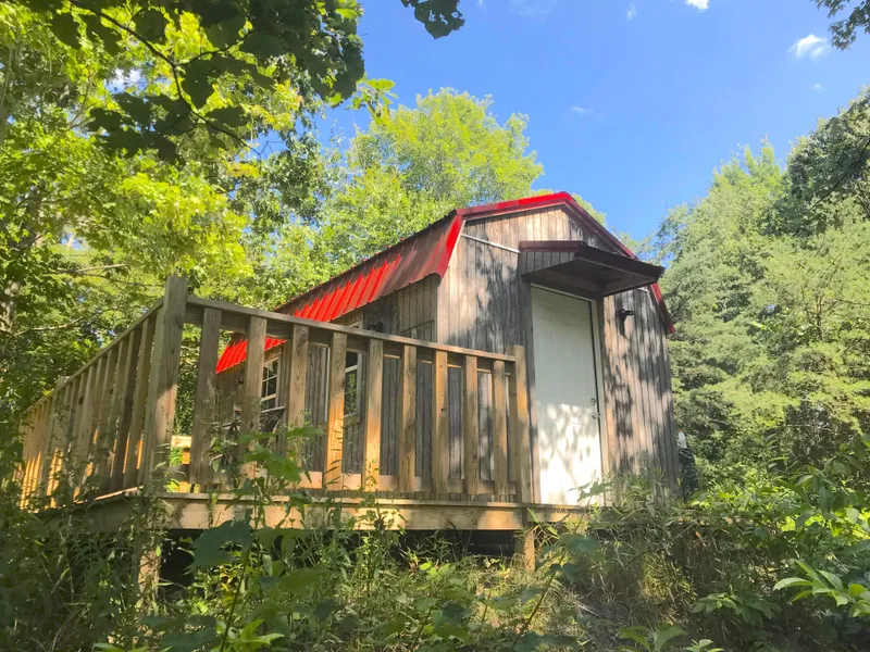 - Cabin measures 10 x 16, has a small loft, & an attached 8 x 16 deck