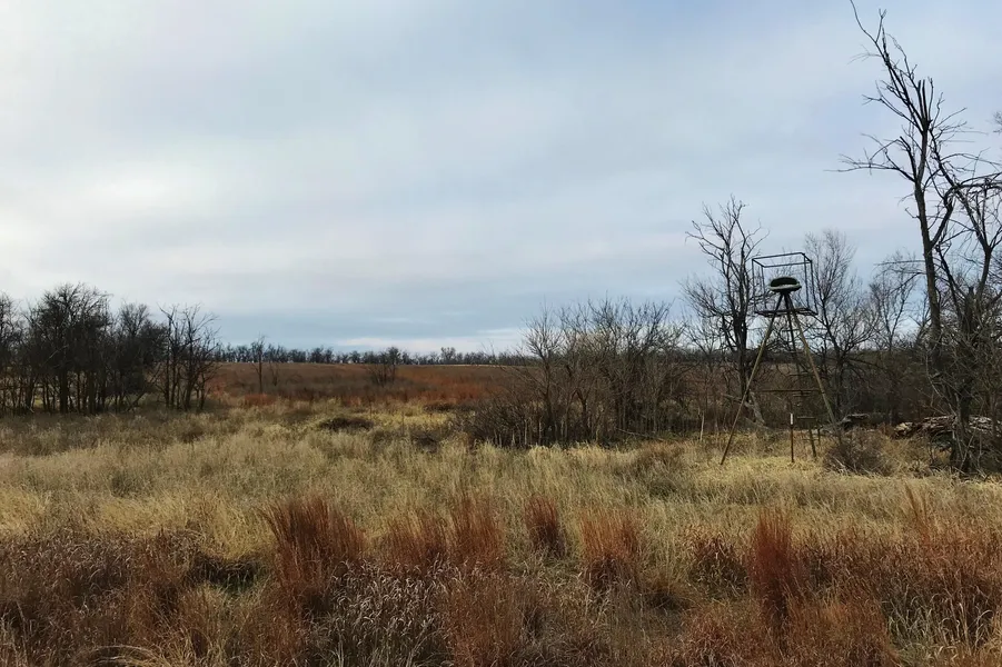 Surrounding the pasture are tall shelterbelts with hardwood trees, creating both privacy and roosting areas for turkeys. Buck and hog rubs are consistent throughout these trees. The shelterbelts provide bowhunting opportunities too, while the pasture allows for long rifle shots. There does not appear to much, if any, immediate hunting pressure around this property.