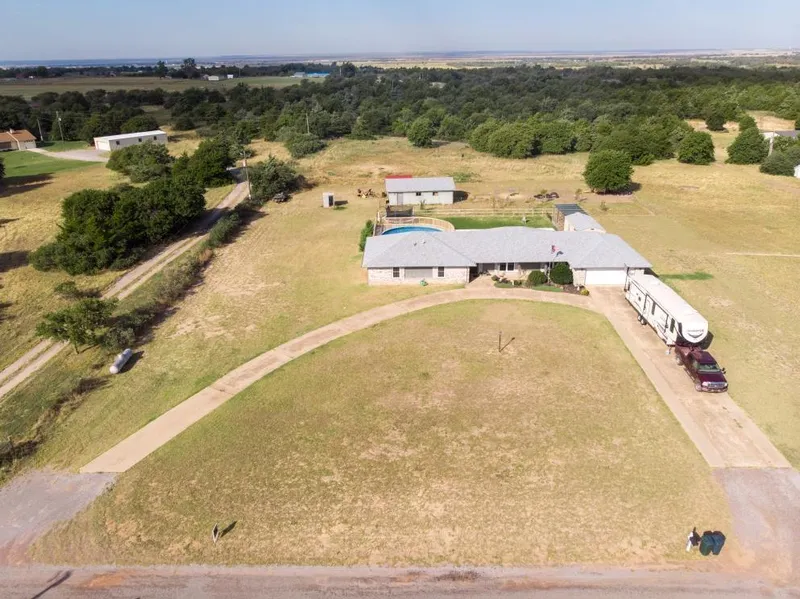 Q U I E T & P E A C E F U L other than the roaming deer and turkeys!!! This property sits on 5 acres and is located in the Navajo School District.The home has 2400+ sq ft that includes 3+ bedrooms, 2 baths, attached 2 car garage w/storm shelter PLUS a 24 x 36 detached garage/workshop. Beautiful wood floors in most of the home, brand new carpet in the bedrooms & living areas and ceramic tile in the bathrooms. Kitchen has concrete countertops, pantry, canned lighting, breakfast bar, SS appliances-refrigerator, double ovens, dishwasher, a beverage/wine frig and tons of storage. Master bedroom is LARGE & the master bath & closet will not disappoint! There are two additional bonus bedrooms/media room, craft room, or could just be for storage!!! A sliding glass door in the oversized dining room takes you to the large back covered patio and the 30 x 48 above ground pool has a custom wood deck surrounding it. This is an all electric home and has a geothermal HVAC