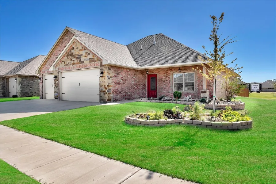 All the comforts you deserve! This 4-bedroom, split plan (2/2), 2 bath & 3 car garage has around 1900 square feet of living space. Located in a newer development right off Altus Air Force Base, this property sits on a corner lot that has sidewalks throughout the entire neighborhood!! The 2 x 6 construction means more insulation and lower utility bills. There is ceramic tile flooring in the main living areas, bathrooms and laundry room with the bedrooms having carpet. The kitchen comes equipped with a granite countertop, SS appliances (refrigerator, gas stove, dishwasher, and microwave), pantry and an island/breakfast bar that overlooks the living area. This is a split plan with the master bedroom and smallest bedroom on one side and the other two bedrooms on the opposite side of the home separated by a 2nd bath. The master bath has a granite countertop, double sinks, soaking tub, separate shower, a private commode area and a huge walk-in closet! The main areas have 5 ¼ baseboards and custom door valances for a more custom look. The living area, dining area and the master bedroom have tray ceilings. Tilt in windows for easier cleaning and blinds throughout. Tankless water heater, storm shelter in garage, water softener, storage shed, rain gutters/downspouts and a privacy fence just to complete the picture!