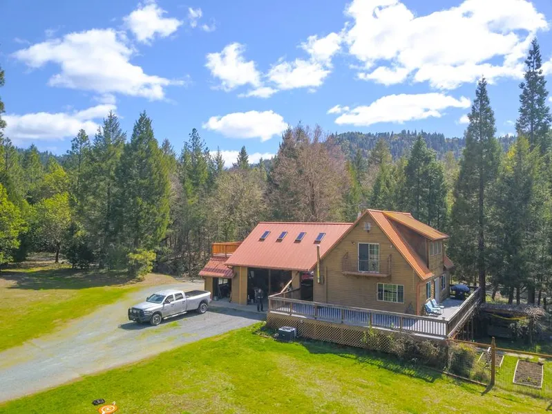 Beautiful 29+ acres of sunny Southern Oregon at it's finest with a year round creek and 120 GPM Well. The majority of the property is level with a mix of Cedar, Pine and Fir, Oak and Madrone Hardwoods, and a few other variety of trees. The home is set by a beautiful lush pasture surrounded by large conifers. The ground level of the home is the central living area with a family room and master suite above. The connected daylight basement has 3 bedrooms including a Master Suite with it's own HVAC, WH and entrance. Once planned as a campground there is a 120 GPM Well, septic system designed for multi use, several trails from the homesite to a fruit tree orchard, open space meadows, year round creek to soak in or pan for gold. Outbuildings include a small cabin with it's own deck, a pole barn for your tractor, RV or boat, with a storage shed alongside. There is a detached shop or garage with...