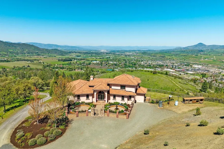 This may be the best view you will ever see! Astounding vistas stretch across the Rogue Valley, beyond the Table Rocks to the Western Cascades. Experience end of road privacy on this 25+ acre estate. This luxury residence presents an old world charm that is warm & inviting, designed for comfort & sophistication. The home features soaring beamed ceilings, stone fireplace, Ironwood cherry floors, walls of windows that extend to the expansive veranda with arched portals that frame the forever view. Large chef's kitchen with Viking Professional range, granite counters, large island & dining bar, formal & informal dining. Beautiful wood detailing features hemlock & knotty alder. Main level primary opens to veranda. 4 bedrooms, 4 baths, total of 4593 SF. Spacious art room/office plus large workshop. 3 car garage. Whether you're hosting gatherings or enjoying peaceful solitude, this home delivers with style, space & serenity -- all in a setting that captures the very best of high-end living.
