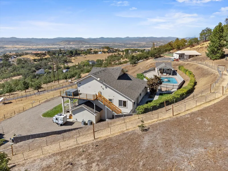 VIEWS VIEWS VIEWS! This private, gated East Medford home offers 4,022 sqft of main home living with breathtaking sunsets and panoramic vistas. The 3-bed, 4-bath with additional office layout is an entertainer's dream. A large balcony and spacious covered patio offer room for entertaining. The 2-car garage and additional RV garage feature vaulted ceilings for abundant storage options. Inside, discover elegant hardwood floors, tray ceilings, and a chef's kitchen with pantry, double ovens, and stainless-steel appliances. The owner's suite is a sanctuary with huge west-facing windows showcasing stunning Rogue Valley views, a private balcony, climate control, hot tub, fireplace, sauna, and built-in wall safe. Outside is a swimming pool with large island, 2 fire pits, plus separate 400 sqft 1 bed, 1 full bath ADU, a barn, spacious workshop. Fenced and cross-fenced, making it turnkey for livestock or horses. The land is also fire defensible space managed. Well recently tested at 7.71 gpm.