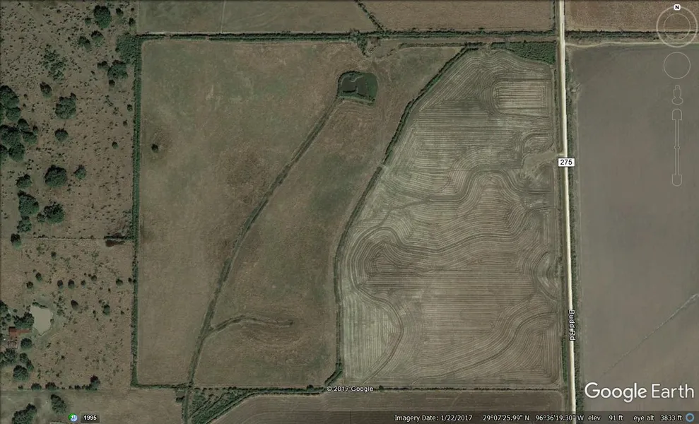 63.35 acres of farmland currently in Rice rotation. This is half of the total acreage recently divided into two equal tracts. This area is productive and there is a corn field on the North boundary. The property is in a rice rotation cycle, currently idle. There is a rice irrigation well on the 5 acre tract adjoining this property that has provided the water for the total 126 acre farm (both 63.35 acre tracts} as well as some acreage across the CR 275 farmed together by same Farmer. No known easements across or through property. The 5 acre property can be purchased, but is not listed for sale.